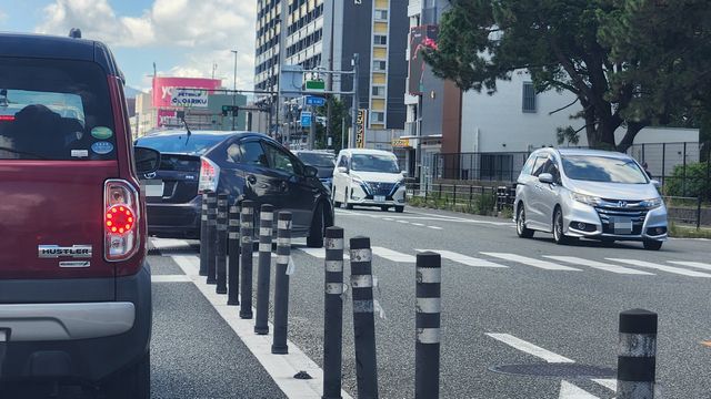 いつものようにお昼頃にショッピングモールに買い物に向かうと片側3車線道路の第3通行帯のセンターライン側の車線が動かない。