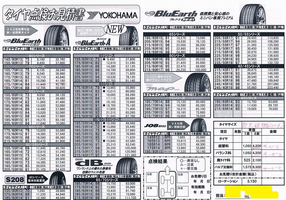 タイヤ交換の工賃無料と手書きで赤のボールペンで書かれ、更にタイヤ代は税込表示になっているのですが、そこから20%値引きしますという内容でした。