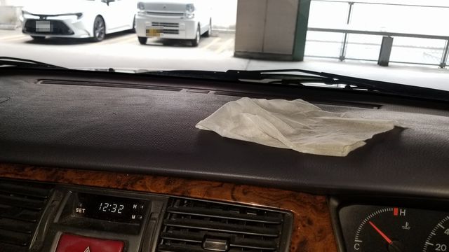 上記はゆめタウンの立体自走式お客様駐車場に駐車して車に、買い物から戻って、帰る前にサクッとダッシュボードの上とかを拭いている様子です。