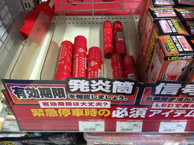 意外とこの発煙筒は、なかなか売っているお店をみつけにくいのですが、オートバックスセブンなどに¥567で販売していたりします。